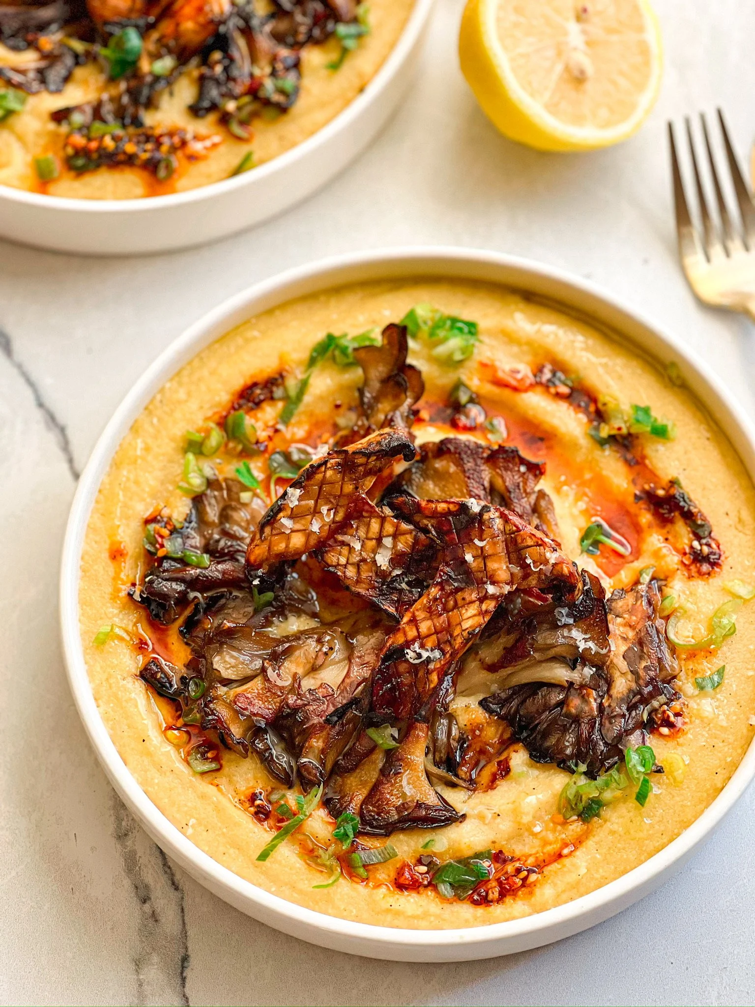 This Creamy Polenta with Grilled Mushrooms is such a heart warming dish! Definitely my favorite this time of year! Cozy, packed with so much umami, it will become your new go to mushroom dish! Mushrooms are marinated and grilled to perfection and served with creamy mushroom coconut polenta.