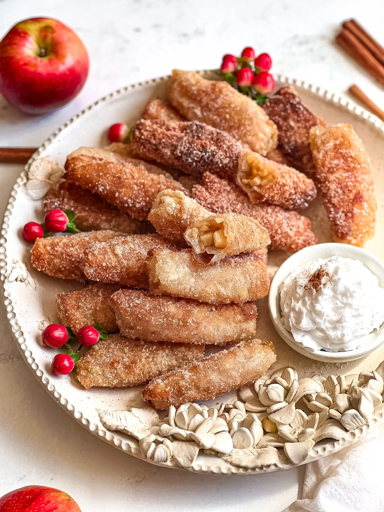 Apple Pie Spring Rolls! Deliciously crispy and light. Serve it with coconut whip or ice cream! Makes 12-15 spring rolls depending on the size of your spring roll wrappers.